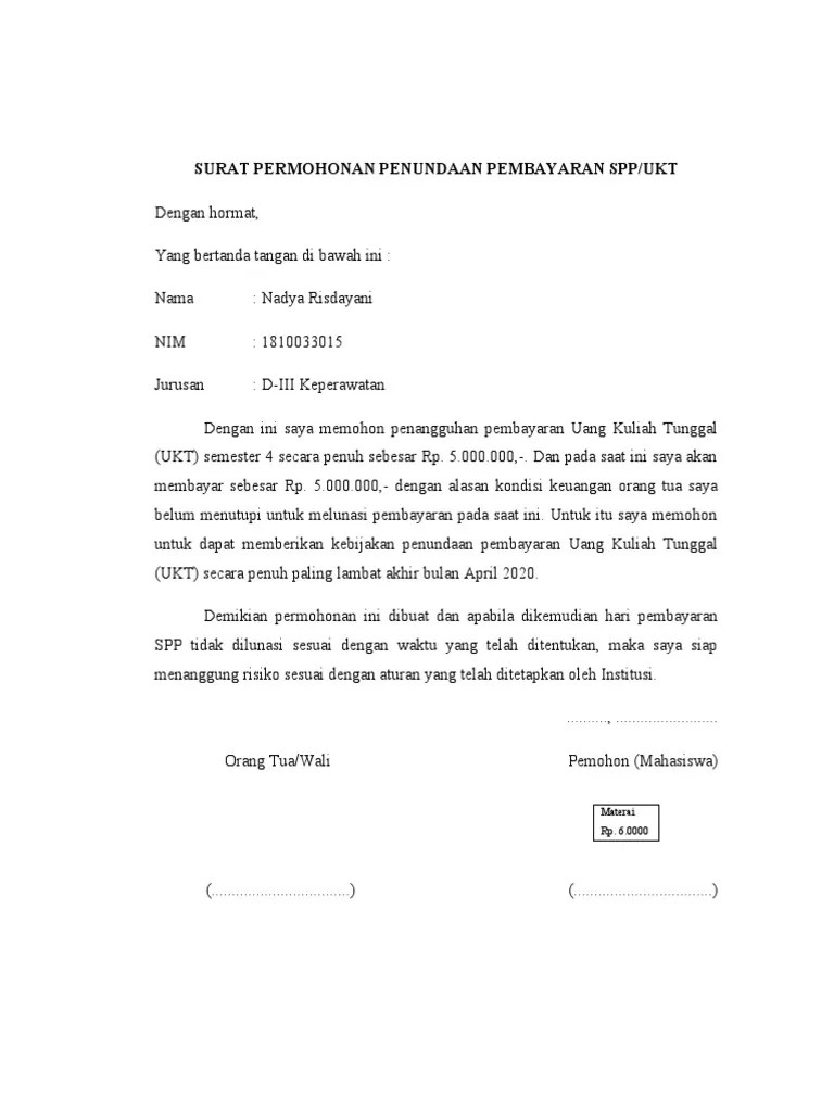 2018/2019 belum dapat memenuhi kewajiban pembayaran spp sebesar rp. Untuk itu di sini saya akan memberikan contoh penulisan surat penundaan pembayaran iuran sekolah (spp) yang ditujukan untuk kepala sekolah . Sebagai bahan pertimbangan bersama ini kami lampirkan asli dokumen sebagai berikut**) : Mengajukan permohonan dispensasi pembayaran biaya kuliah sebesar rp. Terlampir kelengkapan persyaratan berupa : Surat ajuan permohonan diri mahasiswa diketahui orangtua/wali, kaprodi dan kajur; Contoh surat pernyataan kesanggupan membayar kuliah sebagai . Surat keterangan kematian orang tua dari pemerintah setempat;. 12 desain terkait dengan contoh surat permohonan penangguhan pembayaran. Mahasiswa membuat surat permohonan penundaan spp/ukt;